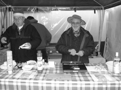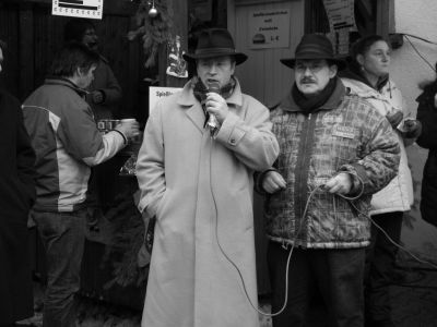 Vor der alten Schule treffe ich auf Herrn R. der Glückliche hat schon einen Weihnachtsbaum gefunden. Bezahlung, Fehlanzeige der Förster ist noch nicht da und so heisst es das gute Stück irgendwo deponieren, denn der Festbraten sollte auch bald ausgesucht werden. Sonst geht es ihm wie Olaf M. der vorne in der Schlange laut rufen muss: ”Rehrücken ist aus Susanne, was soll ich nehmen? ” Ja, beim Kauf von Wildbret am Stand der Jäger sollte man schnell entschlossen sein.