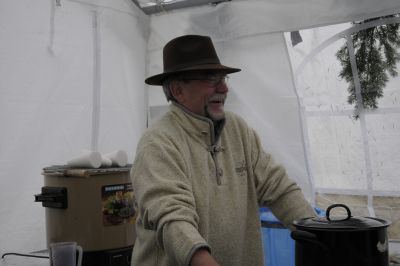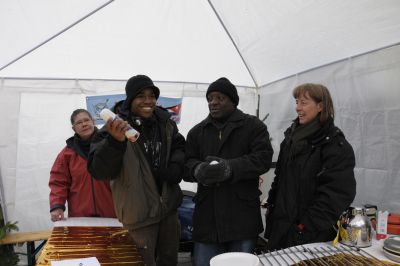Der Frauenchor hat einen Stand mit Plätzchen und dem selbstgemachten Eierlikör an dem auch Martha mit ihren traditionellen Socken zu finden ist. In dicke Mäntel gehüllt trotzen die Damen der Kälte Das Café in der alten Schule bewirten die Turner Damen des TGV.