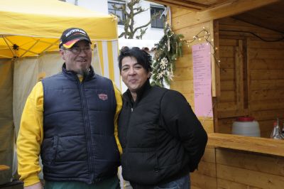 Silla und Jürgen bieten zum ersten Mal ihre brutzel- braunen Kartoffelpuffer mit Apfelmus an und schenken Hochprozentiges aus, was ja recht gut zusammenpasst, das deftige Essen muss ja verdaut werden. Einen guten Appetit.
