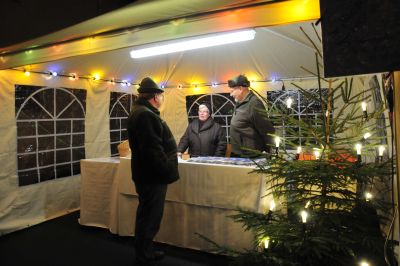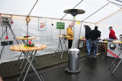 Ein Blick auf den Markt um 13.38 Uhr. Die ersten extra zeitig eingetroffenen Besucher stehen in der Nähe des Verkaufsstandes der Wingsbacher Jäger. Aber hier fängt kein früher Vogel den Wurm, alle müssen bis zur Eröffnung um 14°°Uhr warten. So gehört sich das!