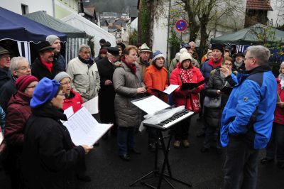 Bevor jetzt das Gewusel zwischen den Ständen beginnt,gibt es noch Chorgesang. Männer- und Frauenchor, sowie Discordia86 haben sich plaziert.Es nieselt leicht, aber es gibt ja Plastik zur Keyboard Abdeckung. Das Publikum darf zum Schluss noch “Oh,du fröhliche” mitsingen.