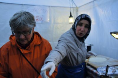 Frau Gülay Yildis hat nicht nur die “Sac böregi” (türkische Teigfladen) unter Kontrolle,sondern auch ihre Helferrin Almut Lyding. “Bitte einpacken,es muss alles schön warm bleiben!” Der Teigfladen mit Spinat und Schafskäse gefüllt gehört mir. Mit meinem türkischem Tee darf ich sogar hinter die Theke und erfahre, dass Frau Yildiz von ihren Söhnen angeregt wurde etwas produktives auf dem Weihnachtsmarkt zu tun.”Mama, wir brauchen doch dringend Geld für die Feldbetten der Jugendfeuerwehr.”Was tut man nicht alles für die Kids.