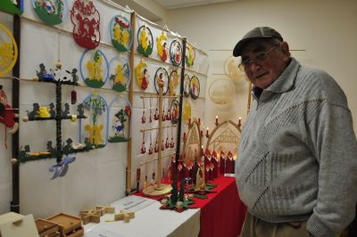 Bevor ich die Schule verlasse schaue ich noch zu Herrn Simon herein. Bei ihm ist es diesesmal recht bunt. Nicht nur Schwippbögen, sondern auch Holzspielzeug und Fensterbilder fürs ganze Jahr hat er aufgebaut.Raffinierte Objekte, die in der Adventzeit Tannenbäume tragen und an Weihnachten zur Krippe umgestaltet werden können.Ein Stäbchenwürfelspiel ist meine Intension und Roswitha ersteht die Schachtel mit den T-Stücken, die aber nur in besonderer Weise alle darin Platz finden.Handwerklich perfekt verarbeitet.
