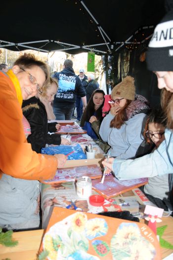 Sabine Rösinger und Simone Helm die Leiterinen des Kinder Turnens haben sich in diesem Jahr für weihnachtliche Seviettentechnik auf roten Dachziegeln entschieden. Die Kids sind mit Feuereifer bei der Sache. “Als Erwachsener hast du keine Chance zu werkeln, die Kinder haben alle Ziegel für sich verbraucht,”erzählt mir Bettina Augenzwinkernd.