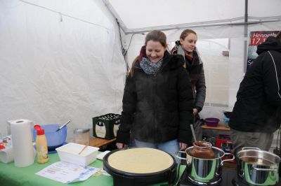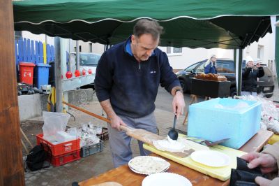 Bio Bäcker Münz bereitet Flammkuchen vor und wie schmeckt er. Hmm... zum Anbeißen. Außerdem kann man bei Ihm Stollen und Brot kaufen. Der Backofen hat seine Tauglichkeit bewiesen, wenn der Bäckermeister im nächsten Jahr wieder kommen will muss das so sein.