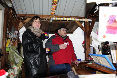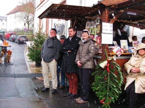 16.Dezember,14°°Uhr,alles steht bereit die Eröffnung des Weihnachtsmarktes zu erleben. Schneefall treibt Gaby Stoll, Bürgermeister Zehner und Pfarrer Görlitz unters Dach. Somit verkürzten sich die Reden erheblich, was aber nicht unbedingt als negativ wahrgenommen wurde.