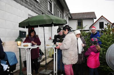Bevor es nun weiter geht kommt erst mal Gesang.Spontan einsetzender Schneefall ließ die Noten samt Text fast verschwinden.”Freuet Euch all” und “neigt sich´s Jahr adventlich” wurden zu Gehör gebracht.