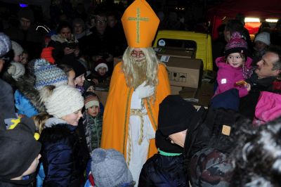 Und schon ist es dunkel geworden.Huch, Das Piaggio knattert und da ist der Nikolaus schon in der Dorfmitte angekommen.Ich bin eindeutig zu langsam,mit dem Starten meiner Kamera. Doch neben mir steht Ingo,er schießt für mich das Foto. Für Ihn bei seiner Größe kein Problem. Danke!