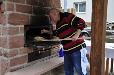 Das war ein aufregndes Event. Das Kochbuch Team entschied gemeinsam, wer noch zur Backgruppe hinzu kommen sollte. Der Ofen muss, wenn er angeheitzt wird voll beladen werden! Wer hat schon Brotbackerfahrung, wer hat Zeit sich auf das “Abenteuer” einzulassen? Die Bäckerinen waren schnell gefunden. Michael Winkler unser “Backesflüsterer” errechnete das Gewicht der rohen Brotlaibe.Jeder der Mitstreiter durfte zwei Laibe mitbringen und Pünktlich um 11°°Uhr wurde eingeschossen.