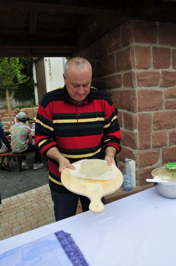 Genau das, war mit Aufregung gemeint. Roswitha Wittlich arbeitete genau nach Rezeptur,aber der Teig wollte nicht aus dem Gärkörbchen.Eine Kastenform ist die Lösung! Experimentierküche auf dem Dorfplatz.Wir haben viel gelacht.