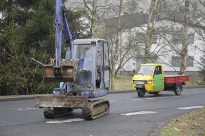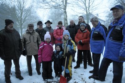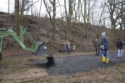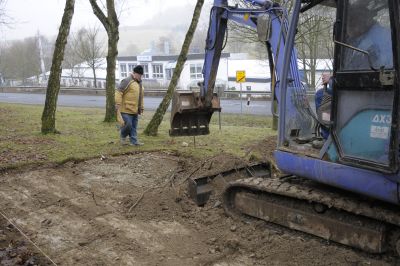 Schweres Arbeitsgerät rückt an. Roland Junior mit seinem Bagger und Jürgen Behrens mit Piaggio, sowie Werner Forst mit Traktor samt Hänger sind ausser einigen “Handarbeitern” mit Schaufeln am 24. Januar pünktlich um 9°° Uhr zur Stelle.