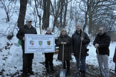 Mit Bratwurst und Brötchen(Dorflädchen) und Glühwein(Ortsbeirat) wurde bei Fackelschein der Spatenstich gefeiert.Die Skulptur heisst Begegnung und durch die Boulebahn samt Sitzgruppe soll der Platz attraktiver und kommunikativ werden. Nach dem Baubeginn im Dezember warten die Wingsbacher nun auf besseres Wetter.