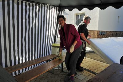 Die Sänger der Discordia86 haben schon mal das Zelt aufgestellt. Bei ihnen gab es Erbsensuppe mit Wurst. Gesang? Ja, natürlich, den gab es erst später auf der schönen Sandsteintreppe.