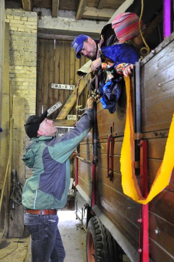 Festzurren, sichern: Thomas und Marc haben diesen verantwortungvollen Job übernommen. Schließlich wird der eigene Nachwuchs beim Umzug auf dem Wagen stehen.