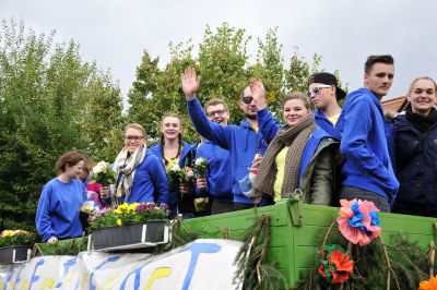 Sicherheitstechnisch darf die Erntekrone keine herab hängenden Bänder mehr haben Na, gut, dann bekommt sie eben mehr Rosen. Von ihrem erhöhten Platz hat die Krone als eine der wenigen schon den Überblick.