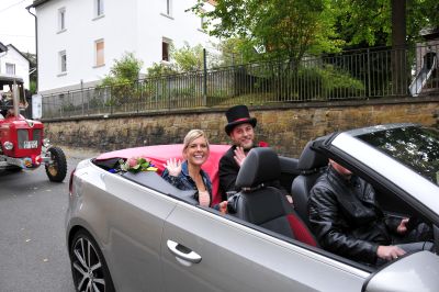 Reinhold Hieß hat Nina als Unterstützung auf dem Erntewagen! Ja, super, ich dachte schon es wird in diesem Jahr wohl keinen geben. Die Kerbegesellschaft hat ihn zusammen mit Reinhold gestaltet.Von ihm kam sozusagen die Grundausstattung und für Früchte und Gemüse sorgten die Kerbemädcher.Das finden bestimmt alle Wingsbacher cool.
