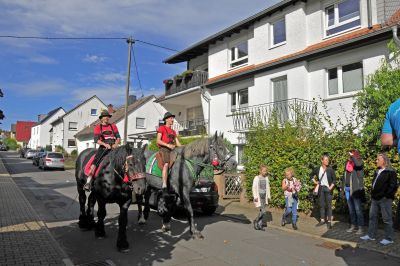 Das Schlusslicht des Zuges gehört noch zur Hahner Kerbegesellschaft. Belle und David Kupfer sind mit ihren Percheron Hengsten Calypso und Bandito ein Hingucker.
