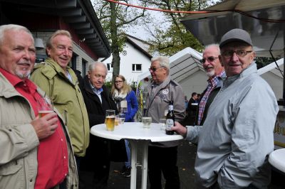 Dienstag 3. Okt. 10.20 Uhr Frühschoppen vor der Halle. Das Wetter spielt wieder mit und ich begrüße etliche Leute, die mir stolz verkünden:”Ei, mer habbe schon gesse!”Okay, aber ich bin nicht zu spät,es gibt genügend Speis und Trank. Weißwurst und Spießbraten Brötchen schmecken lecker. Das Karussell dreht kostenfrei seine Runden. Das Kassenhäuschen wird nicht gebraucht, sieht aber sehr dekorativ aus. “Hau den Lukas”, hier sind gerade die Mädels an der Reihe. Die Männer lassen locker die Glocke klingen,vielleicht etwas mehr Kraft, oder so? Jetzt lockt ein anderer Duft mich zwei Schritte weiter, hmm....,Popcorn.Tim macht das fachmännisch. “Gemoje un Prost!” Die Herren am Stehtisch genießen Wein und Bier. Wer schaut denn da aus dem Fenster? DJ Ingo strahlt wie immer und ist für den besondern Sound zuständig. Richtig schnuckelig hier, klein, aber es ist alles da.