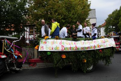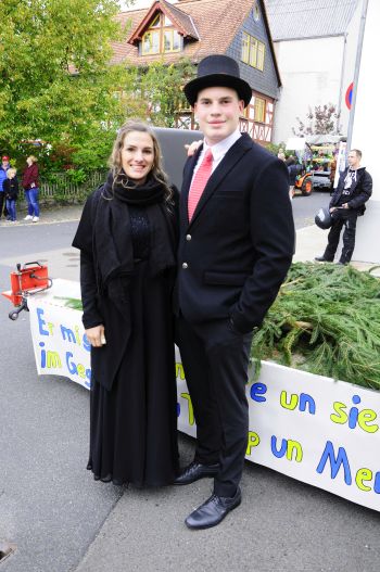 Als erstes seht ihr, das ist klar, das Kerbe Paar von diesem Jahr. Den Spruch auf ihrem Wagen sollte man vielleicht erklären. Nina Ernst macht die Kerbemutter zum xten Mal und bei Benjamin Rick ist es das erste Mal. Aber was hat das schon zu bedeuten? Das Strahlen nach langer Nacht klappt gut, das schwarz macht etwas blass, aber die frische Luft wird es schon richten.