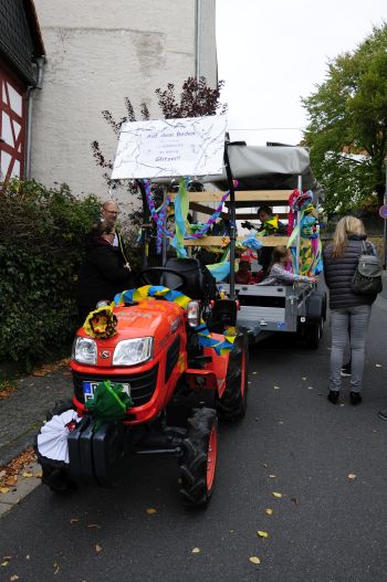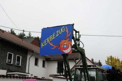Das ältere Semester an Kerbeburschen und Mädchen. Äußerte sich auf dem Transparent auch politisch: “Umweltschädlicher Diesel wird aus den Städten verbannt, dafür werden wir von Menschen auf E-Scootern umgerannt.” Der Fahrer des Treckers wird zwar nicht umgerannt, aber sicher patschnass.