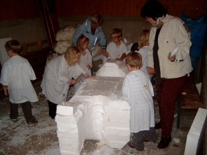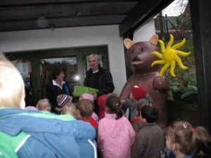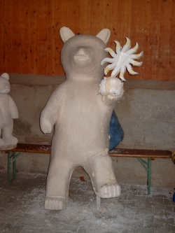Zusammen mit dem Hobbykünstler Jürgen Behrens basteln die Kinder einen zwei Meter großen Sonnenbären, der voll und ganz ihren eigenen Vorstellungen entspricht. Und weil ein Bär eben immer noch ein Bär ist, wollten die Kinder erst gar keine Verwechslungen mit einem drolligen Kuscheltier aufkommen lassen und einigten sich auf ein möglichst natürliches Erscheinungsbild. "Die Kinder sind absolut diszipliniert und haben eine Fingerfertigkeit, als hätten sie schon immer in diesen Größen gearbeitet", sagt Jürgen Behrens. Der Künstler staunt selbst, welche Dimensionen das Projekt inzwischen aufweist. In den vergangenen Wochen hat das neue Maskottchen Form angenommen. Aus einem gigantischen Styroporhaufen haben die Kinder Bärenkonturen gesägt, Rundungen heraus gefeilt und dem Tierchen eine Ganzkörpermassage mit Putz und Harz verpasst, anschließend noch die Farbe aufgetragen. Dabei durften sogar die Zweijährigen helfen, die seit dem Sommer in den Kindergartengruppen integriert sind. ”Lebensgroß, stahlverstärkt und mit einer riesigen Sonne in der braunen Tatze ist der "Sonnenbär" fertiggestellt.
