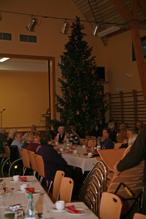 Unter dem prächtigen Weihnachtsbaum warten die Senioren auf Kaffee und Kuchen und das bunte Programm. Die Kindergartenkinder sind ein großer Programm Punkt.