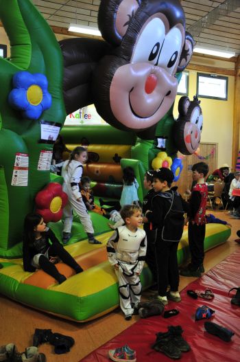 Mit vielen fleißigen Helfern hat Jana die Halle am Samstag wieder hübsch gemacht. Kinder Fastnacht ohne Indoor- Hüpfburg undenkbar. Ausgepowert und strahlend darf es dann, bei Mama am Tisch, auch mal was zu Trinken sein.