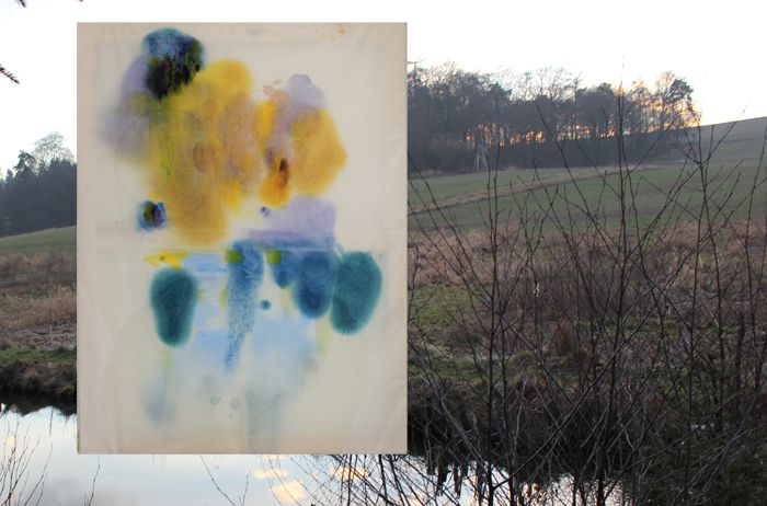 12.10.2015, Kirsten Kötter: Site-specific Research Karbach, Öl auf Stoff (zuvor gefaltet), ca. 100 x 120 cm - hinter mir plätschert das Wasser in den Schilfteich, was mein Bild mit bestimmt hat. Kraniche zogen beim Malen am Fischteich vorbei Richtung Wingsbach. |