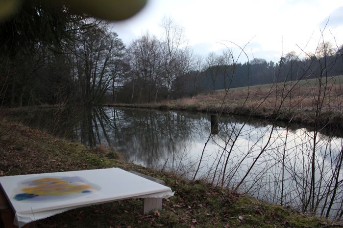 „Site-specific Research“ nenne ich meine Malerei an besonderen Orten. Diese Orte liegen nicht nur in der Natur. Ich halte mich an ihnen länger auf und male und erzähle in Videos von der Malerei und was dort dabei passiert ist. Hier möchte ich jetzt von meinem „Site-specific Research“ bei Wingsbach erzählen. 2006 haben wir das Waldgrundstück mit den zwei Teichen im Gebiet „Obere Karbach“ von der Familie Schäfer erwerben können. Ich bin dort so oft, wie es Zeit und Wetter zulassen.