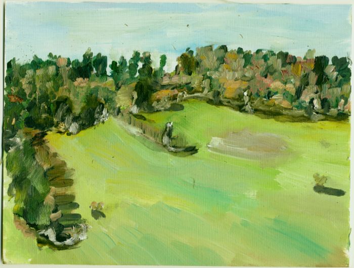 05.06.2015, Kirsten Kötter: Site-specific Research Karbach, Öl auf Stoff (Nessel), 110 x 109 cm - ein Sommertag, etwas dunstig, weiches Licht.