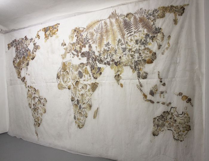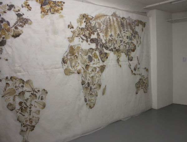 Weltkarte aus gepressten Pflanzenteilen, die in durchsichtigen Stoff geleimt wurden: Blätter(teilweise) und Kräuter sowie Farn (ganz) in der Karbach gesammelt, dazu Salatblätter, 4 x 5 m, Projektraum basis Frankfurt. |