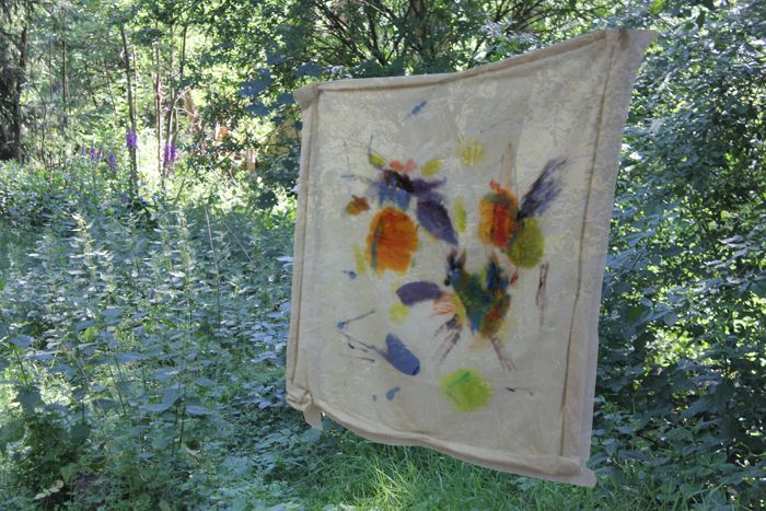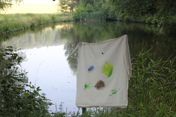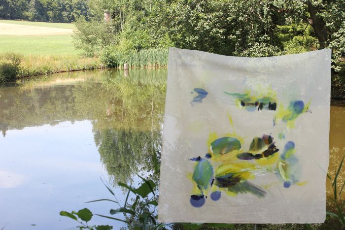 Wenn ich unterwegs an Orten male, aquarelliere ich oft, weil Aquarellfarben und Papier gut zu transportieren sind. Auf unserem Waldgrundstück kann ich experimentieren. Deshalb sind hier viele große Formate mit Ölfarben entstanden. In den letzten Jahren habe ich mit Öl auf Stoff (Nessel) gemalt, den ich auf Keilrahmen gespannt habe. Neu für mich ist es auch, den Stoff vor dem Bemalen in Falten zu legen oder zu rollen.