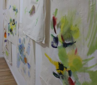 Bild unten: Bemalte Stoffe von Kirsten Kötter in der Ausstellung "Site-specific Research" in Berlin (14. - 21.02.2016, Curator's Novel, Berlin)