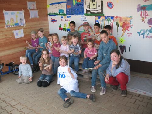 Jürgen Behrens, der die Malaktion leitete, lobte die kleinen und großen Künstler, die ruhig, konzentriert und selbstbewusst an die große, weiße Fläche herangingen: Jeder bannte im eigenen Stil seine Ideen an seinen Teil der Wand und war mit seinem Ergebnis zufrieden. So funkeln dem Betrachter jetzt weiß gewandete Gespenster eines Spukschlosses zur Geisterstunde entgegen, gemalt von Pia (12 Jahre). Im Aquarium von Toygarhan (8 Jahre) tummeln sich bunte Glitzerfische. Und bei Tamina (4 Jahre) lässt Rapunzel ihr wallendes, goldenes Haar herab – um nur einige Beispiele zu nennen.