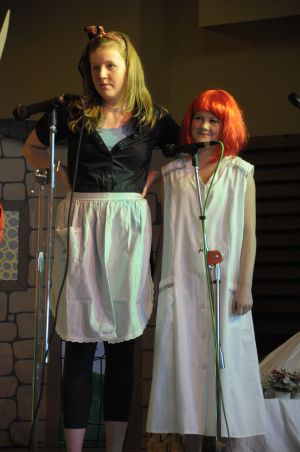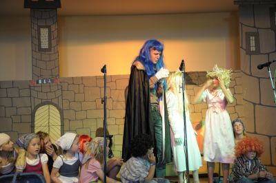Doch plötzlich kann eine Harfe sprechen und wie ein Echo ruft sie: “ Der König hat lange Ooooohren, er hat ganz lange Löffelooooohren!” Jetzt ist das Geheimnis gelüftet. Alle wissen es. Wie peinlich für Donkeyking. Vor allen Untertanen wird er bloss gestellt! Doch seine Frau(Pia Schmitz)rettet ihn in dem sie ihre langen Ohren aus der Haarpracht hervor holt. Auch Aisling hilft.“ Papa du musst dich doch nicht schämen, schau Mama hat auch solche Ohren und alle haben sie lieb.” “ Ja, habt ihr mich mit solchen Ohren auch lieb?”, fragt er die Dorfbewohner. “ Ja, hoch lebe unser König“, rufen alle im Chor. “ Ja, lieber Mann, denn wahre Schönheit kommt von innen und Königliche Stärke bemisst man nicht an den Ohren”, sagt die Königin weise. Da muss Donkeyking eingestehen, dass er dickköpfig war, doch die Harfe hat ihm die Augen geöffnet. “Aber wieso kann eine Harfe sprechen?” fragt der König in die Menge. Paddy schiebt sich nach vorne: “ Ich glaube das ist meine Stimme. Als ich das Geheimnis in den Wald gerufen habe, muss es der Feenbaum gehört und gespeichert haben. Und diese Harfe wurde ja aus dem Holz dieses Baumes gebaut. Als dann auf der Harfe gespielt wurde hat sie das Geheimnis wieder frei gegeben. “ Ziemlich viel Zauberei”, meint der König. Als seine Tochter ihn nun bittet, lässt er sofort alle Frisöre frei. Hurra! Jawohl! Hoch lebe unser König Donkeyking!