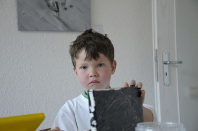 Jonas der jüngste Teilnehmer hat die erste Aufgabe schon bewältigt und den bespannten Rahmen mit schwarzer Farbe grundiert und beschliesst für sich , dass auch die Plastikdecke eine Massage mit Farbe gut gebrauchen kann. Ab und zu hört man Adrianas Zwischenruf: “ Denkt daran, die Farbe nicht mit Wasser mischen! “