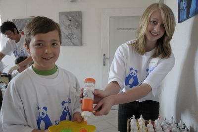 21 Kinder in Pandabären Shirts gestalteten mit fachkundiger Hilfe in den Schulungsräumen der Firma Stoll Diabetes Service Zentrum ihr ganz besonderes Geschenk für den kommenden Sonntag. Alles ist für das Arbeiten mit Farbe vorbereitet und es herrscht eine fröhliche, farbige Stimmung.