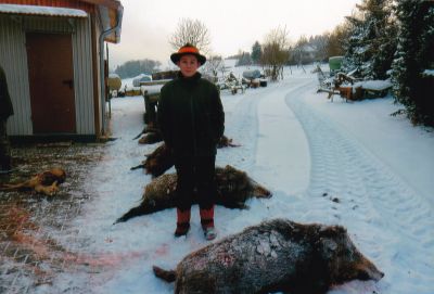 „Das ist für mich noch nicht wichtig, dafür braucht man ein bestimmtes Alter und auch einen Waffenschein. Das Ansprechen, still sein, Geduld haben, in den Wald hören und ein Gefühl für richtiges Verhalten auf dem Hochsitz bekommen, das waren meine ersten Lernziele. Mein Freund Manfred hat im ersten halben Jahr in meinem Beisein nie auf ein Tier geschossen. Mein Interesse wurde von den ständig neuen Eindrücken angeregt und das war meinem „Lehrer“ wichtig.“ Das merkt man, ich staune nur noch über das fundierte, umfangreiche Wissen meines doch noch recht jungen Gegenübers. Das Wild seine Anatomie, das Jagen,das Hegen, der Wald als Lebensraum sind seine Themen. “ Auf dem Foto- die erste Drückjagd bei der ich dabei war.”