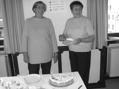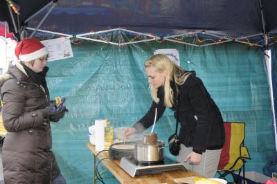Der Frauenchor hat einen Stand mit Plätzchen und dem selbstgemachten Eierlikör an dem auch Martha mit ihren traditionellen Socken zu finden ist. In dicke Mäntel gehüllt trotzen die Damen der Kälte Das Café in der alten Schule bewirten die Turner Damen des TGV.