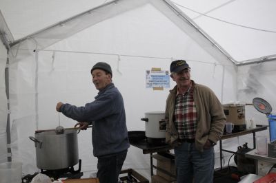 Silla und Jürgen bieten zum ersten Mal ihre brutzel- braunen Kartoffelpuffer mit Apfelmus an und schenken Hochprozentiges aus, was ja recht gut zusammenpasst, das deftige Essen muss ja verdaut werden. Einen guten Appetit.