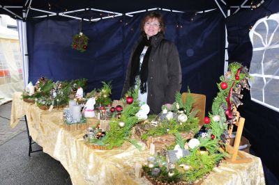 Aus Bornich kam Frau Petra Weiser mit adventlichen Gestecken. Alles selbst hergestellt. Die Häuschen, die Zäune, die Bänke.Viel Arbeit und Liebe zum Detail das sah man. Für meinen Geldbeutel leider nichts dabei. Schade,aber Qualität hat nun mal ihren Preis.