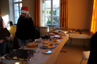 Na,ihr Beiden? Gertraud und Gerlinde bedienen Plätzchen Kunden am Stand des Frauenchores und schenken auch Eierlikör aus. Habt ihr auch noch Socken von Martha. Klar, alles noch zu haben.