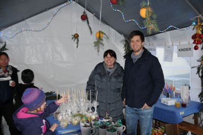 Hinter Herrn Simons Stand hat sich der Ortsbeirat ein Plätzchen für die Tombola Preise eingerichtet. Marc Horaczek läßt einen schnellen Klick zu, da ja erst die Lose verkauft werden müssen. Das macht Steffi Hofstetter mit Hingabe und ruck zuck sind alle Lose weg.