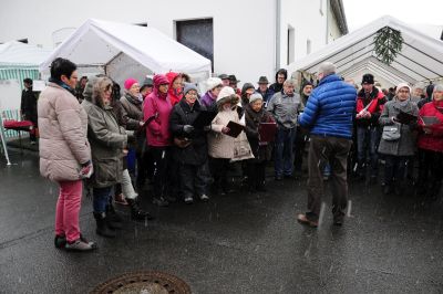 Bevor es nun weiter geht kommt erst mal Gesang.Spontan einsetzender Schneefall ließ die Noten samt Text fast verschwinden.”Freuet Euch all” und “neigt sich´s Jahr adventlich” wurden zu Gehör gebracht.