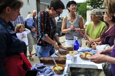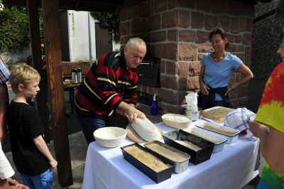Genau das, war mit Aufregung gemeint. Roswitha Wittlich arbeitete genau nach Rezeptur,aber der Teig wollte nicht aus dem Gärkörbchen.Eine Kastenform ist die Lösung! Experimentierküche auf dem Dorfplatz.Wir haben viel gelacht.