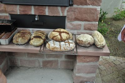 Das war ein aufregndes Event. Das Kochbuch Team entschied gemeinsam, wer noch zur Backgruppe hinzu kommen sollte. Der Ofen muss, wenn er angeheitzt wird voll beladen werden! Wer hat schon Brotbackerfahrung, wer hat Zeit sich auf das “Abenteuer” einzulassen? Die Bäckerinen waren schnell gefunden. Michael Winkler unser “Backesflüsterer” errechnete das Gewicht der rohen Brotlaibe.Jeder der Mitstreiter durfte zwei Laibe mitbringen und Pünktlich um 11°°Uhr wurde eingeschossen.
