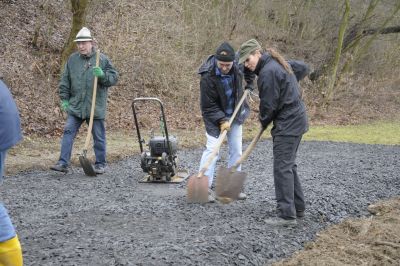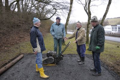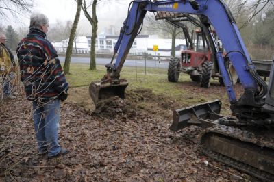 Schweres Arbeitsgerät rückt an. Roland Junior mit seinem Bagger und Jürgen Behrens mit Piaggio, sowie Werner Forst mit Traktor samt Hänger sind ausser einigen “Handarbeitern” mit Schaufeln am 24. Januar pünktlich um 9°° Uhr zur Stelle.