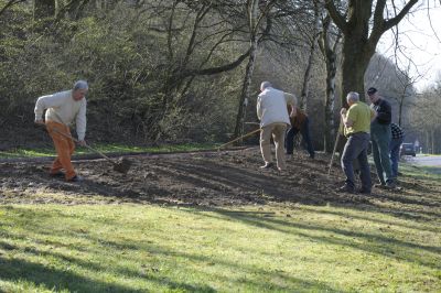 Eine Fuhre Mutterboden muss noch in Feinarbeit beigefüllt und verteilt werden. Peter darf nur inne halten, weil Jürgen die wichtigste Frage des Morgens stellt: ”Hast Du auch das Bier kaltgestellt? ”