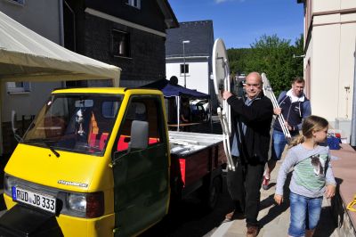 Was tuckert so früh zur Dorfesmitte? Ein buntes Piaggio. Das kann nur Jürgen mit den “Möbeln” sein, die Gäste müssen ja irgendwo sitzen.Tragende Helfer sind auch zur Stelle.