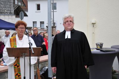 Die Pfarrbeauftragte Cläremie Kouchha (kath. Kirche)und Pfarrer Görlitz (ev. Kirche) halten den Segnunggottesdienst und runden ökumenisch das Fest ab.